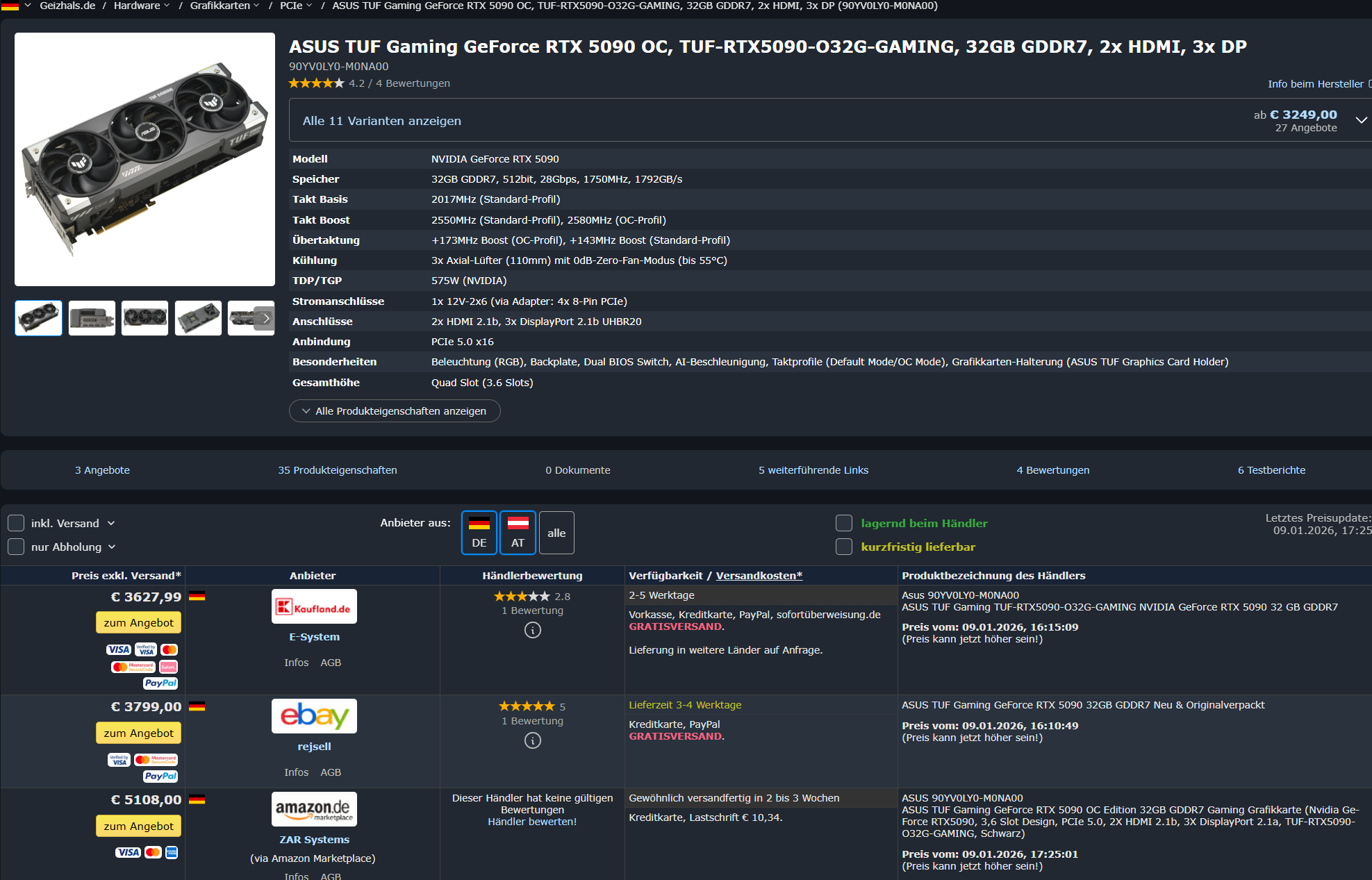 Meine 5090 schnurrt nun im PC seit knapp einem Monat. Die 5090 Vanguard kostete 2600€, direkt bei MSI gekauft. Die hatten auch nur die eine und danach war der Shop leer.