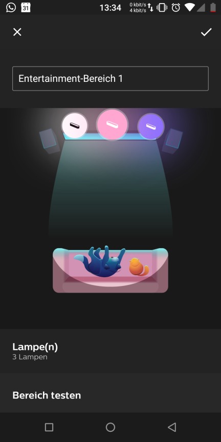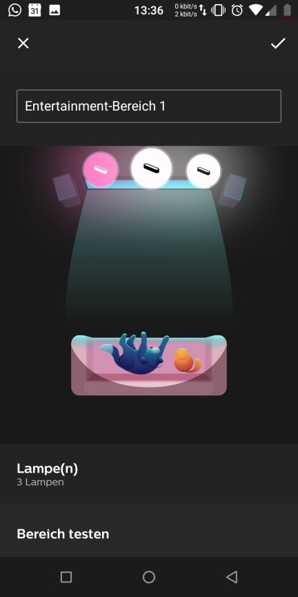 an die Seite des TV-Bildes an die gleiche horizontale Lage stelle (in der App übereinander lege) und nur die vertikale Lage (Höhe) ändere (eine Leuchte "Decke", die andere "Boden"), dann wird für beide die gleiche Farbe gewählt.