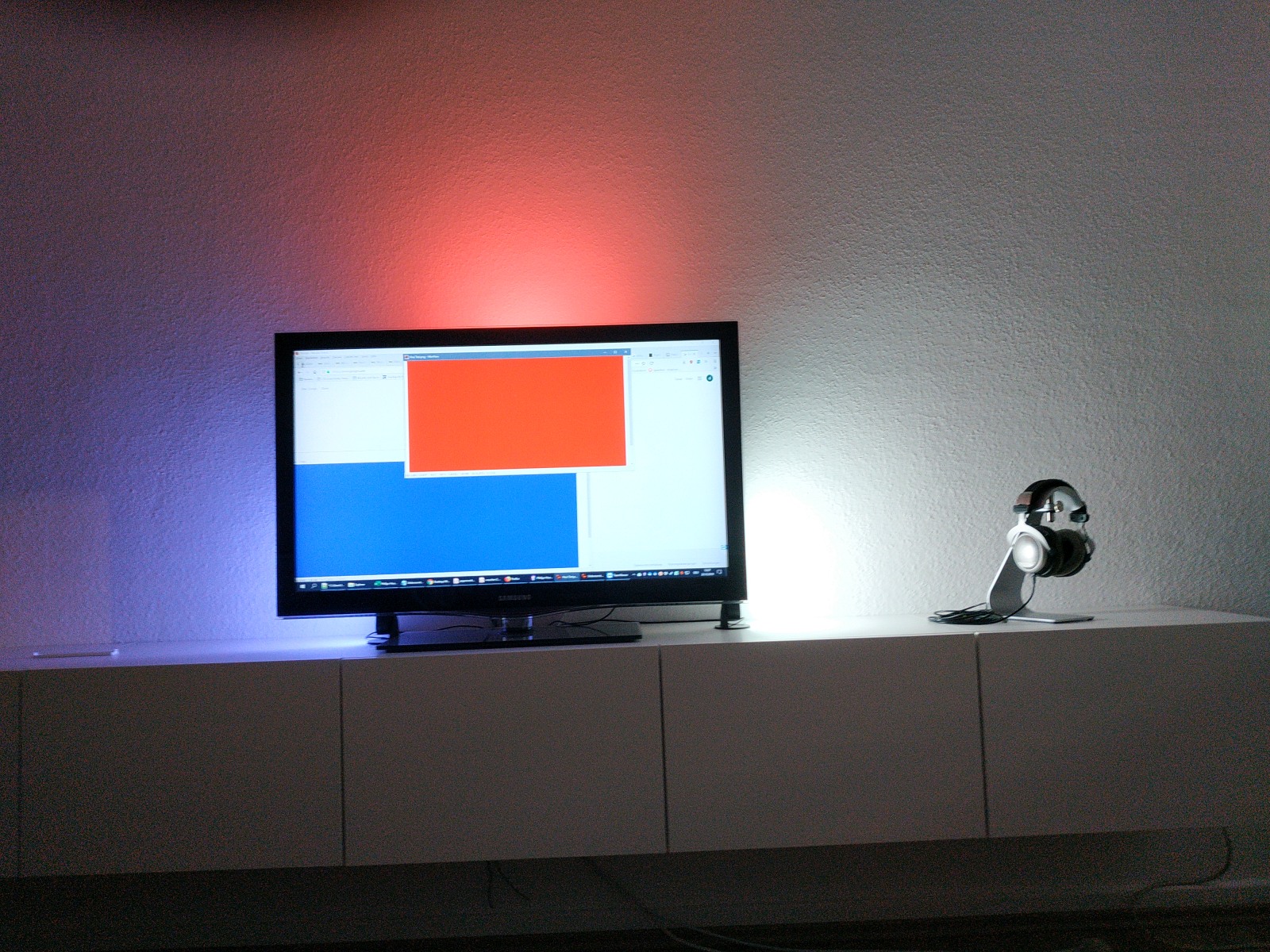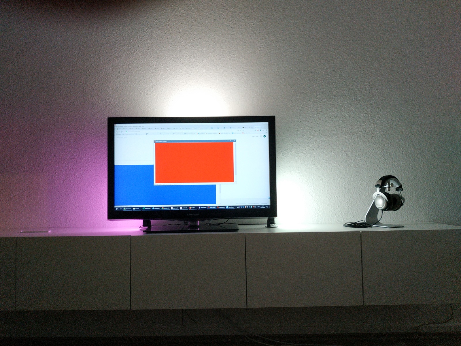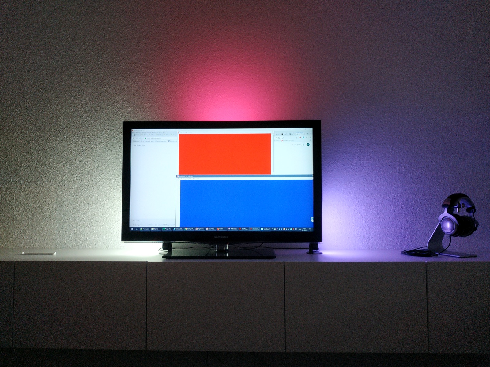 Durchschnitt des Bildbereiches ermittelt und an die Leuchten gesendet. Kleiner, aber feiner Unterschied. natürlich beeinflusst eine dominante Farbe stark das Ergebnis, aber halt nicht ausschließlich. Sieht man auch an diesem Foto, wenn die Höhe der mittleren Leuchte "TV-Höhe" beträgt. Aus blau und rot wird pink/lila.