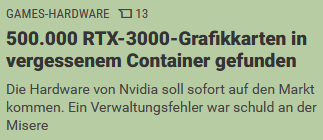 Die Grafikkarten werden am laufenden band nachproduziert und kommen immer wieder in den markt. Mit Geduld bekommt jeder eine zum vernünftigen Preis. Ungeduld kostet halt Geld. Wer ungeduldig ist, muss mehr zahlen, wer warten kann, kann Geld sparen. Die Händler bieten ungeduldigen Leuten nur eine Option an. Wer das Geld locker aus der Portokasse zahlen kann, der wird sich freuen. Wer für die UVP schon monatelang sparen musste, sollte sich halt in etwas Geduld üben.
