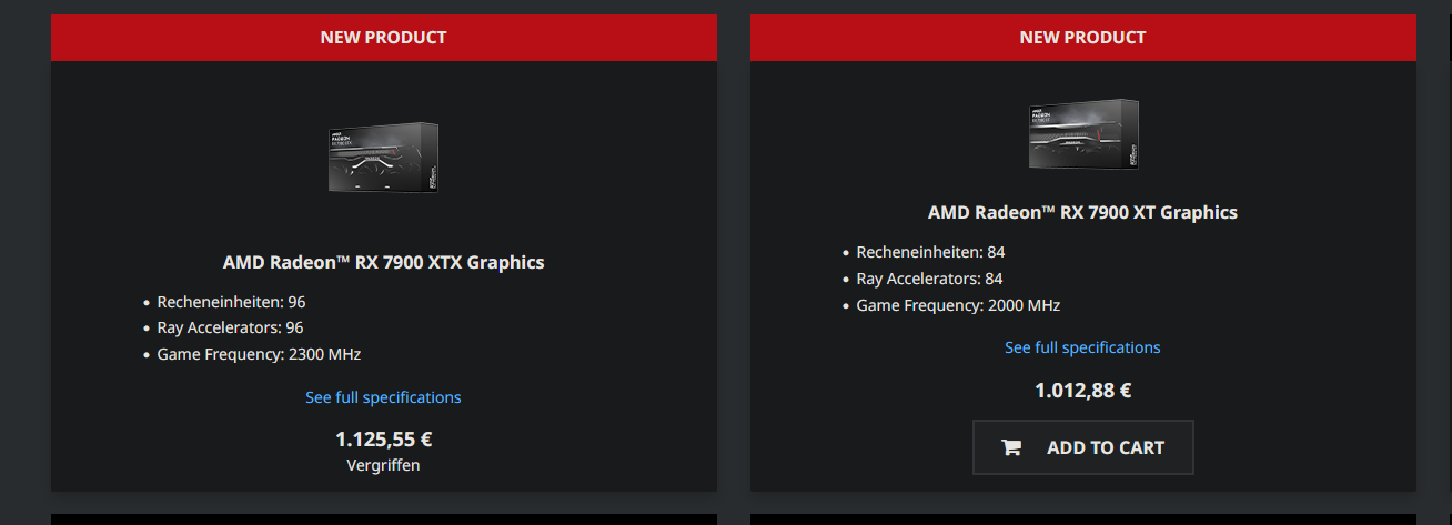 Wer jetzt noch halbwegs guenstig eine RDNA2 Karte ergattern will, sollte sich allerspaetestens jetzt starten sich umzusehen, denn die Grafikkarten-Preise neuer Generationen kennen seit Jahren eine Richtung (die Preissenkungen haben wir nur dem Kryptomining-Boom-Crash zu verdanken und diesen Sondereeffekt/volle Lager wird es beim RDNA3 Abverkauf in 2 Jahren wohl ziemlich sicher nicht mehr geben) und diese ist leider nach oben, was auch schon durch wieder steigende RDNA2 GPU-Preise und ausduennende Modellvielfalt bei Haendlern andeuten.