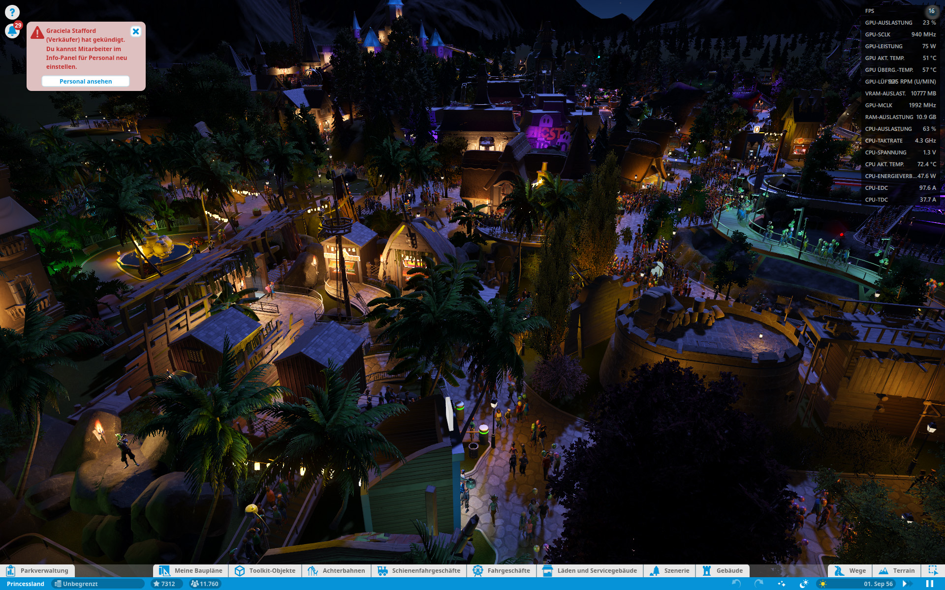 Mein Park ~12.000 Besucher. Die rx6800 langweilt sich, während die Simulation läuft. Es ist auch absolut egal, wo man sich im Park befindet oder wie weit man rein oder raus zoomt, die Simulation benötigt immer gleich viel CPU Leistung, entsprechend bleiben die FPS konstant bei 16