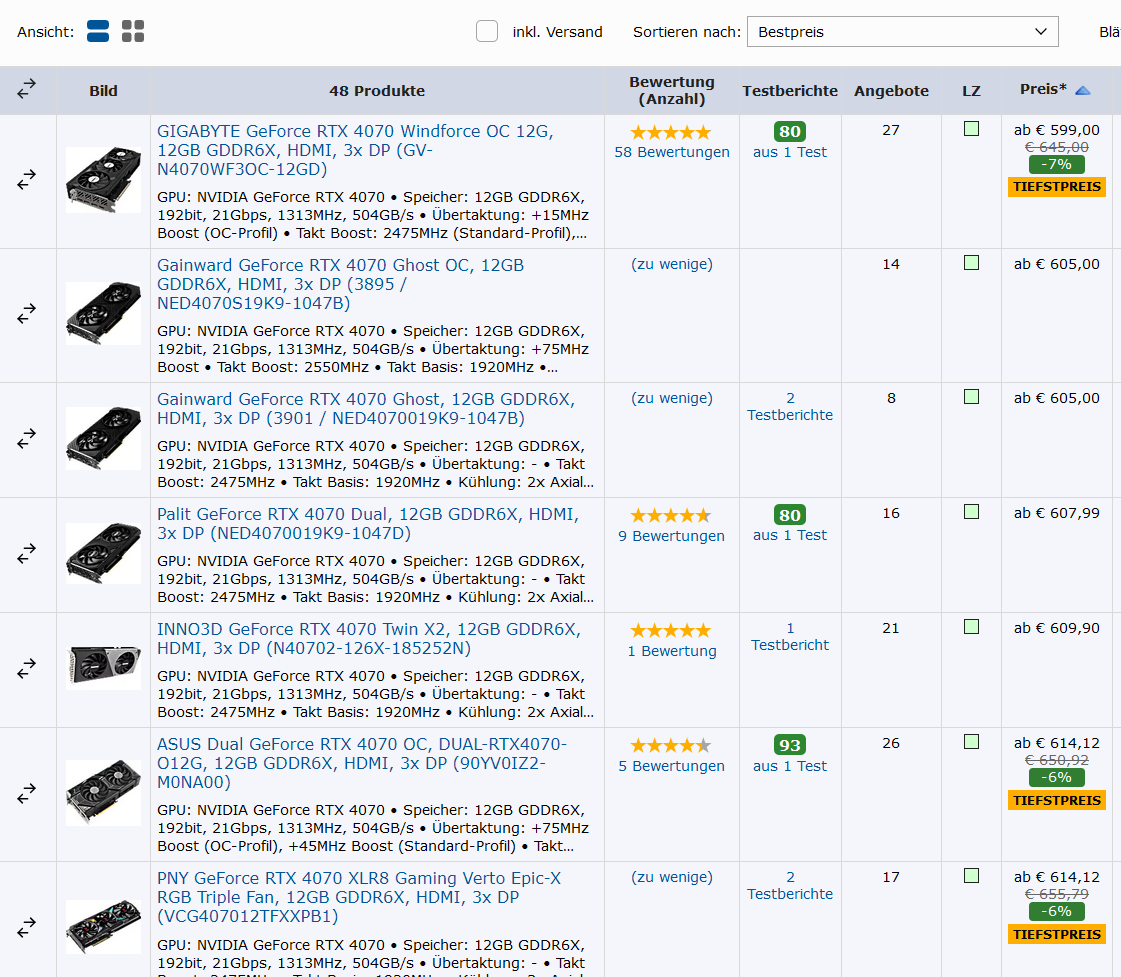 Die ersten teureren Karten haben schon neue Tiefpreise (in Österreich). Die günstigeren werden da sicher bald nachziehen und sie unterbieten.MiniM3 schrieb:4070 bitte für 500€