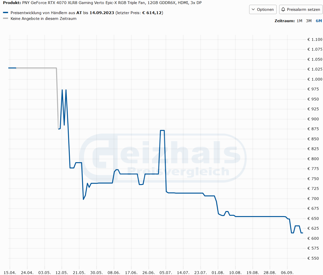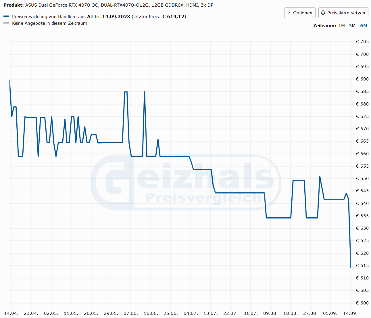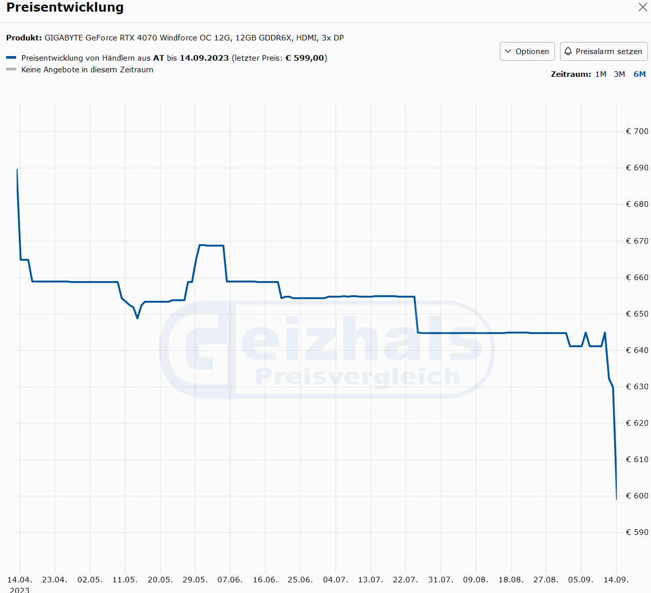 Wenn man den Preisverlauf öffnet sieht das Bild ähnlich aus wie bei den 4060TIs: