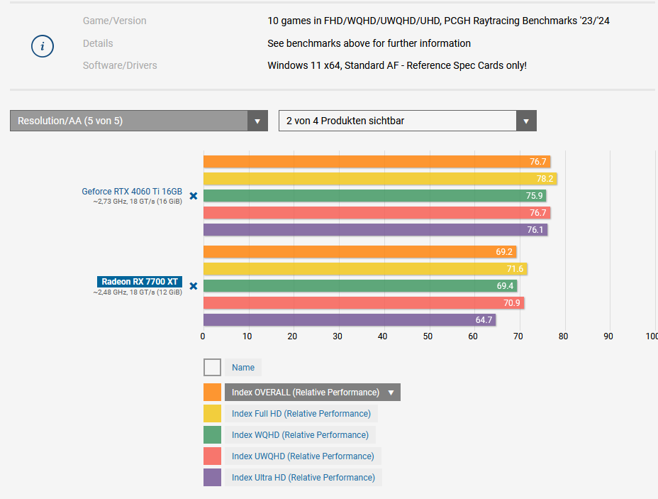 Bei einem Preisgleichstand zwischen RX 7700 XT und RTX 4060 Ti 16GB ist die AMD-Karte immer noch die bessere Option. Im Durchschnitt gewinnt sie in allen Auflösungen sowohl in Rasterizing als auch Raytracing gegen die Geforce - zum Teil sogar deutlich.