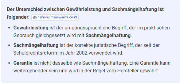 Hänst du dich an "Gewährleistung" und "Sachmängelhaftung" auf ? Ich kapiers nicht. Ist das Gleichewern001 schrieb:Der genau Wortlaut in der Anzeige ist wieder was anderes.