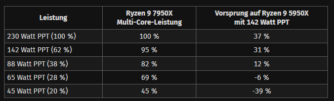 Bei den Spiele-Benches liegt der 7950X ja bei 118W durchschnittlicher Leistungsaufnahme, kaum mehr, als der Vorgänger 5950X (113W), bietet dafür allerdings gut 20% mehr Leistung. Gar nicht so verkehrt.