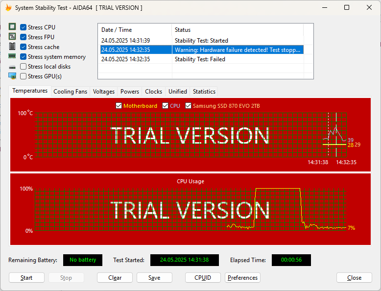 Also siehe oben, mit absoluten Stock einstellungen sofort Abbruch im Aida 64 staiblity test.