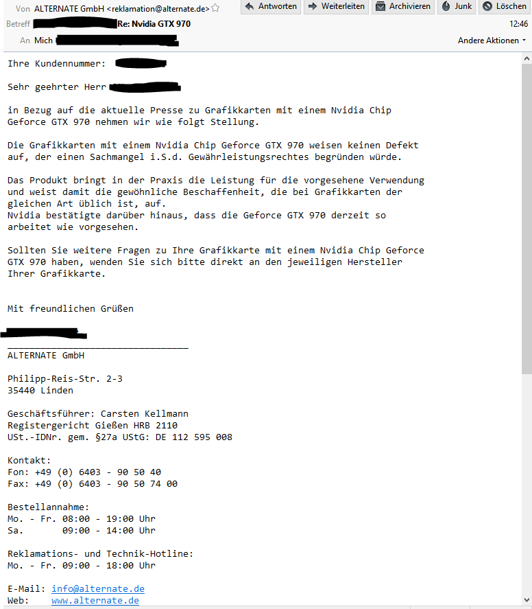 Übrigens: EVGA hat mir direkt eine Rückerstattung angeboten. Ohne Pipapo, ohne 3 Tage auf eine Mail zu warten. Das ganze Embargo um die 970 ist eine gute Gelegenheit, sich eine Liste mit Händlern zu erstellen, die man in Zukunft einfach meidet. Denn an solchen Sachen sieht man dann, wer wirklich auch mal dem Kunden was gönnt. Goodbye ALTERNATE.