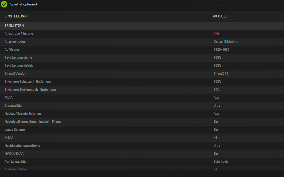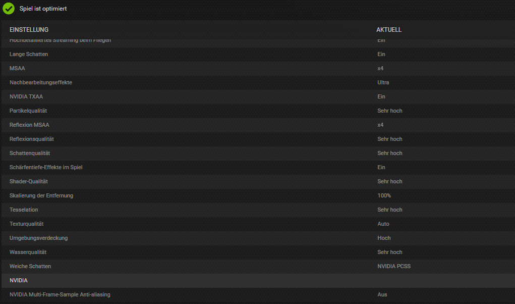 Banger schrieb:Stelle im Treiber adaptives V-Sync (nicht halb) und mache im Spiel das Gras auf Hoch, das spart GPU und CPU. Erweiterte Sichtdistanz ist mit 10% schon niedrig, spart auch CPU. Das MSAA sollte nicht das Problem sein. Wenn die FPS auf unter 60FPS absacken, wird kurzzeitig V-Sync automatisch abgeschaltet.