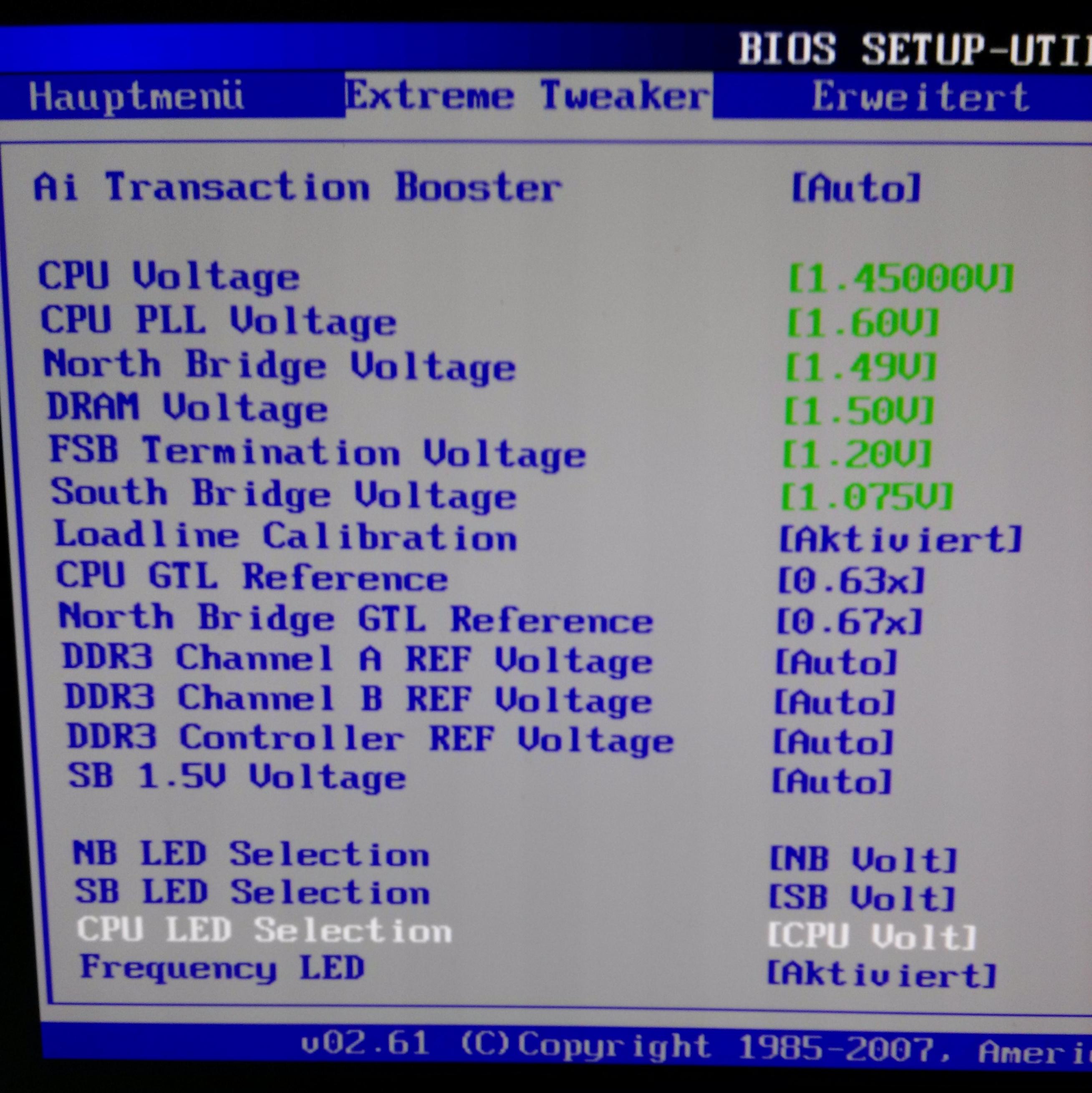Spannung runter wär gut, Takt erhöhen besser über Fsb.Morgen schaun wir mal ob wir die Spannungen doch noch etwas senken können oder noch der eine oder andere Multi mehr drin sitzen.