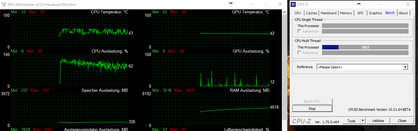Sehe ich das richtig, dass unter CPU-Z Stresstest die CPU nur 41° hat? Das zeigt nämlich das obere linke Diagramm im Afterburner an (erster Screenshot). Da stimmt aber mit der CPU Auslastung was nicht, die müsste auf 100% sein.