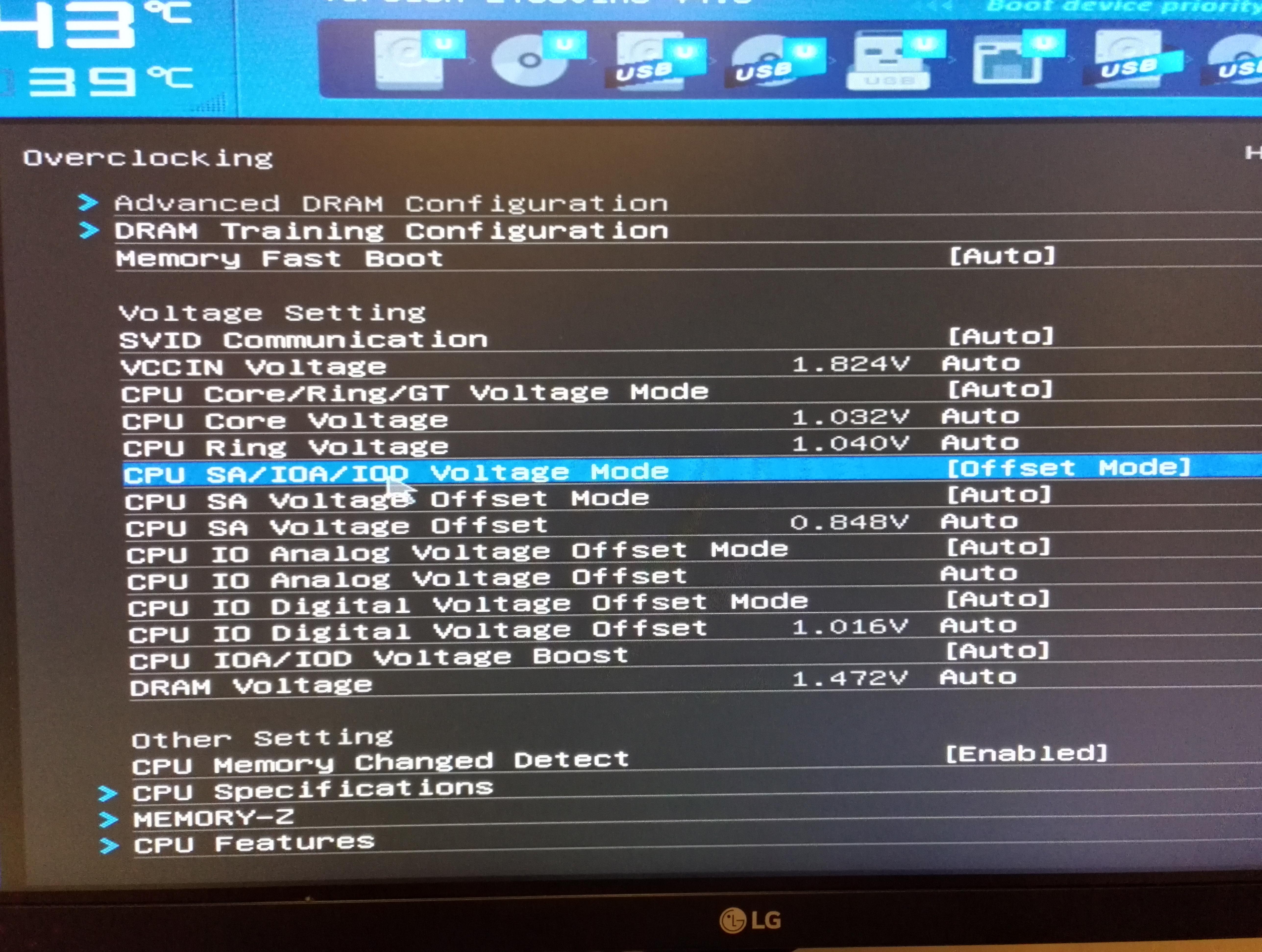 Die markierte Zeile ist defaultmäßig auf Manual Mode (es gibt nur manual/offset, kein auto). Hab sie mal auf Offset gestellt und den Rest auf Auto gelassen. Als das nix half hab ich auf manual umgestellt und die "CPU Core/Ring/GT Voltage Mode" einmal mit "Adaptive + Offset", einmal mit "Offset Mode" + Rest auf Auto und einmal mit "Offset Mode" + zusätzlich bei der Offset Core Mode auf "-" und bei der zugehörigen Offset Core Voltage auf "0.033" (Differenz zwischen den jetzigen 1.040 und den 0.710 die die CPU im Idle vor dem Undervolting hatte) gestellt.