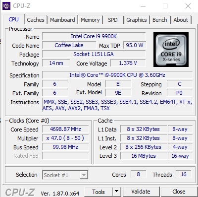 Habe meinen 9900K mit den Auto-Settings im Bios laufen lassen und unter prime95 in HWI augelesen, dass das Mainboard unter Last über 1,5V anlegt. Empfehle unbedingt, die Spannung selbst anzupassen. Bei mir läuft er nun auf 4,7GHz/allcore mit 1,37V, die Temperaturen bewegen sich um die 70°C...