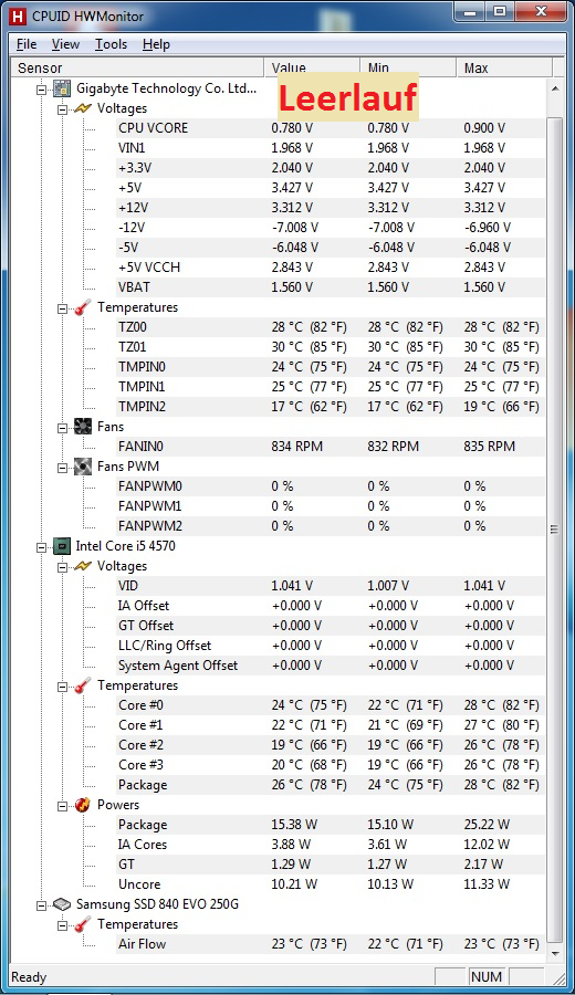 Die Werte im Leerlauf habe ich 10 Min. nach Systemstart gemessen (Windows 8 x64)