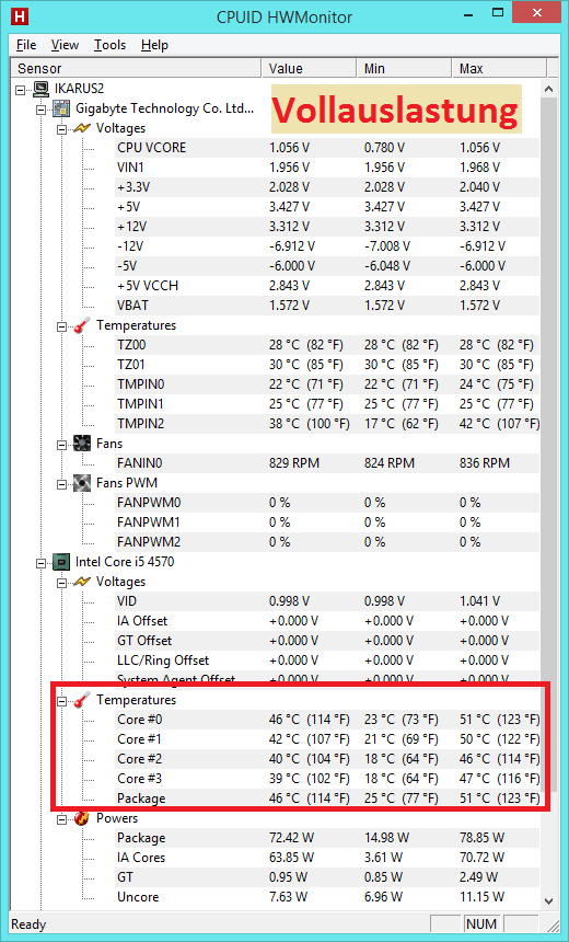 Dann prime95 gestartet und nach ca. 10 Min. die Werte (Vollauslastung) ermittelt.