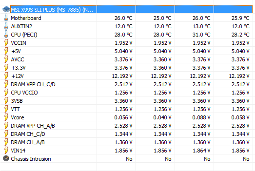Die erste Spalte (dunkelgraue Werte) sind die momentan anliegenden Spannungen und die zweite Spalte (weiße & rote Werte) sind die vom Benutzer eingestellten Werte. Man sieht, dass ich die CPU SA auf 1.300 eingestellt habe. Es wird jedoch in der Spalte davor kein (dunkelgrauer) Wert angezeigt --> das Board liefert eben keine Infos dazu.