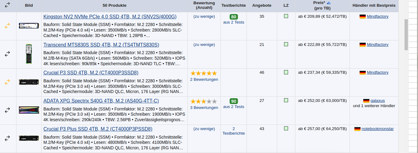 Die Samsung 980 Pro 500GB kostet schon 72€.