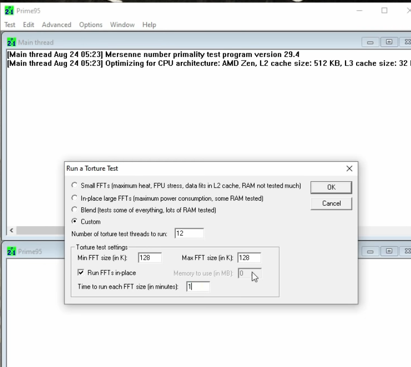 In short (wie immer auf eigenes Risiko usw): PBO +200, Vcore, LLC und Multi auf Auto bzw Stock setzen, die Limits PPT, EDC und TDC entsprechend (so dass Thermal und Voltage die Limits sind, müsstest du ergoogeln für deine CPU) dann ab ins Windows, Prime starten und so einstellen wie im Screenshot, HWInfo oder CPUZ auch aufmachen. Starten für paar Sekunden, das reicht, VCore ablesen. Das ist das Maximum, was deine CPU unter allcore (!) Last verträgt, damit du auch noch länger was von der CPU hast.