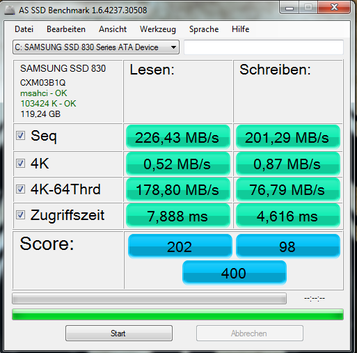 Die 4k_64 schreibend sind zu gering, das sieht ja aus wie bei einer 830er, genau wie die seq. Schreibrate. An welchem Rechner / Controller hast Du das gebencht? Wenn es das Gigabyte 770TA-UD3 in Deine Signatur war, dann muss da ein Zusatzcontroller wie der HighPoint Rocket 640L sein, für das dem Board aber der nötige PCIe x4 Slot fehlt zumal ja eine GTX460 den PCIe x16 Slot belegt oder Du hast die PCIe Lane gewaltig übertaktet und die SSD hängt am Marvell 9128.Warhorstl schrieb:Name: Samsung SSD 840 PRO Series