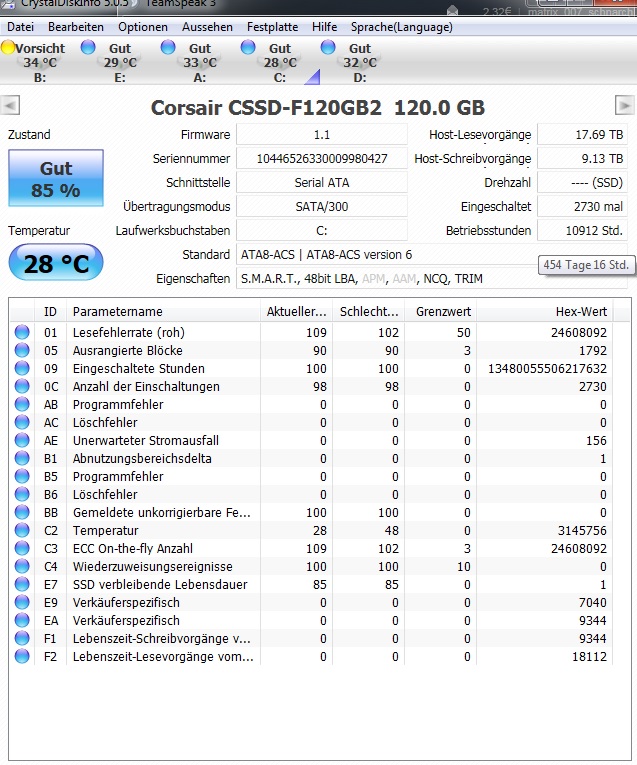 Das ist eine mit dem alten SF-1222 und die sterben relativ häufig, nur sieht an dafür in den S.M.A.R.T. Werten meist vorher keine Anzeichen. Deine hat aber sogar schon eine ganz Menge ausrangierter Blöcke (Hexwert 05), was für nur 7TB die in die NANDs geschrieben wurden (Rohwert E9) recht viel ist, weshalb die Restlebensdauer auch nur noch mit 85 angegeben sein dürfte.