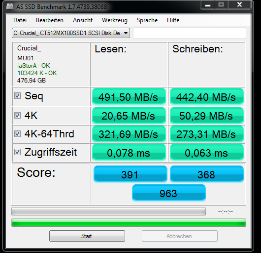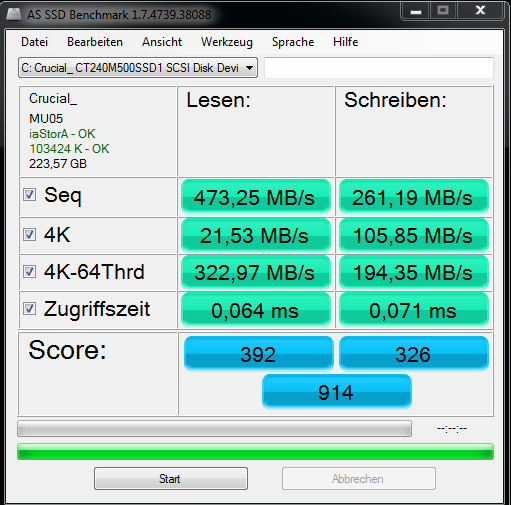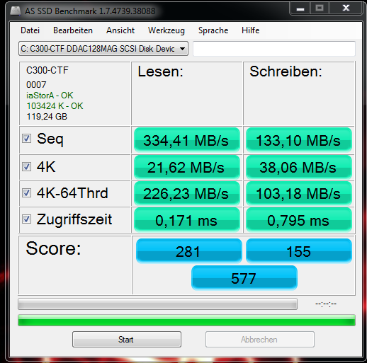 outta, die seq. Leserate ist seltsam. Benche mal im Abgesicherten Modus von Windows. Vielleicht hat es auch nur während des Tests viel Zugriffe durch andere Programme auf die SSD gegegen, was die Werte halt auch verschlechtert oder der Virenfinder war doch nicht ganz aus.