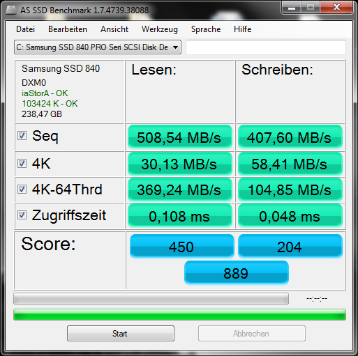 So sieht das bei meiner SSD830 aus. Ich bin damit zufrieden. Die SSD ist über 2 Jahre alt und hat 4,2 TBW drauf. Die Tests habe ich im abgesicherten Modus gemacht und an den Energiespareinstellungen, die es im BIOS gibt, nichts verändert.