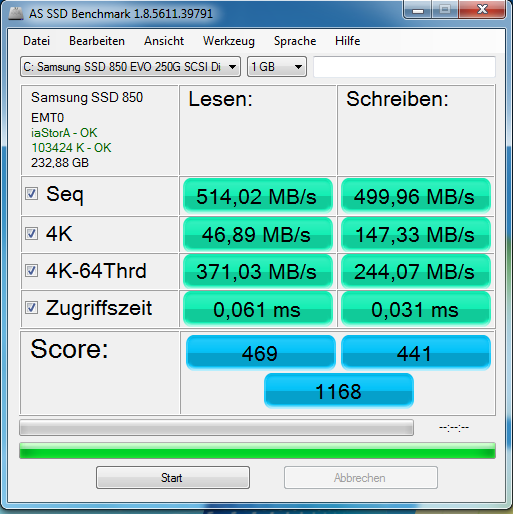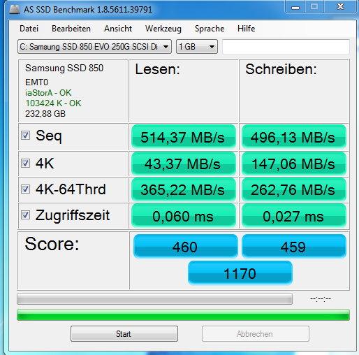 Verschlüsselungen wäre z.B. mit Bitlocker oder Truecryt. Die Werte passen und zeigen auch keine Probleme mit dem SATA Datenkabel. Die Werte sind damit zumindest nicht zu erklären, aber der Treiber (iaStor) ist der Intel Treiber, die SSD kann also nicht an einem Zusatzcontroller hängen und wenn der Schreibcache deaktiviert wäre, wären die 4k Schreibend noch viel schlechter.