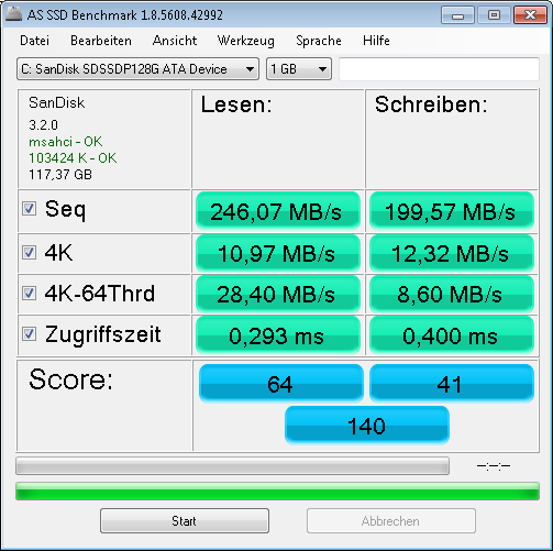 Die SSD hat keinen Sandforce, die hat den eigenen Controller von SanDisk. Fotos der Platine der SanDisk SDSSDP gibt es hier bei hardwareluxx:deo schrieb:Mehr ist von der billigen Sandisk mit altem SandForce SF-1222 Controller nicht zu erwarten.