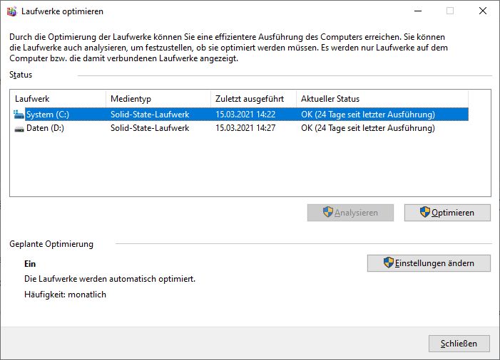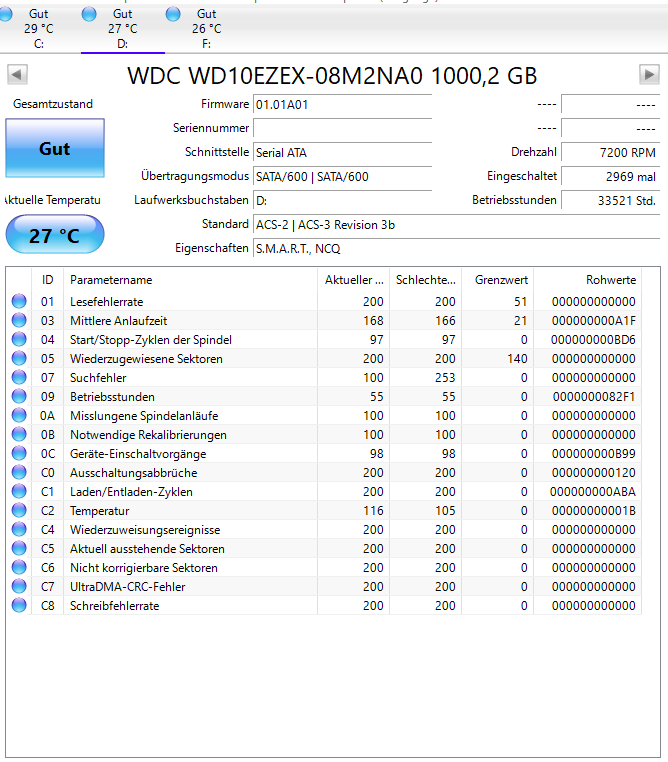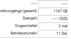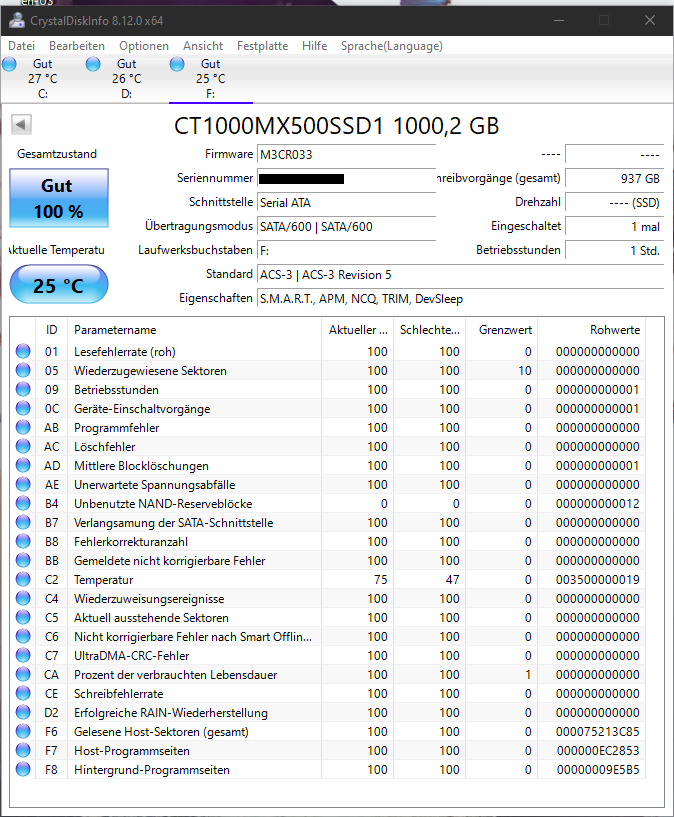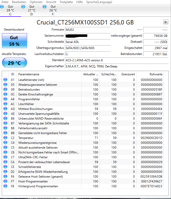 Zum Vergleich eine MX500 gleicher Kapazität, die keine 3 Jahre mit Windows 10 genutzt wurde. Der TLC-NAND hält viel weniger aus und trotzdem wird die SSD über 10 Jahre lang klaglos Daten schreiben. f: ist eine USB-Platte, bei der ein Reservesektor einen kaputten ersetzt hat. Crystal Disk Info ist da ziemlich kleinlich. Die MX500 hat noch eine alte Firmware drauf, weil ich keine Lust habe, mich mit dem SSD Tool von Crucial herumzuschlagen. Das ist eine Katastrophe. Die SSD hat immer mindestens 40°C, weil sie ziemlich nahe über dem Mainboard hängt und die CPU wird passiv gekühlt.
