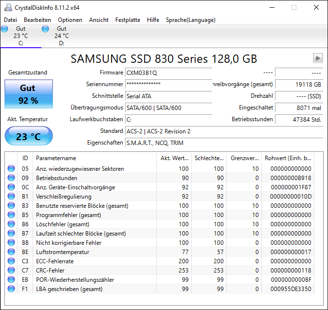 Und das ist meine SSD830 von 2012, die immer noch als Systemlaufwerk arbeitet, deren MLC-NAND kaum abgebaut hat.