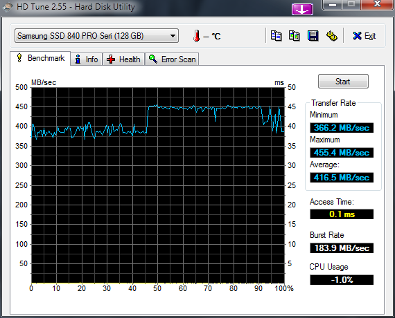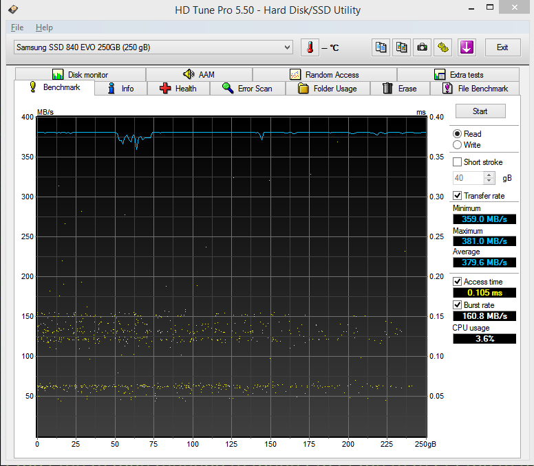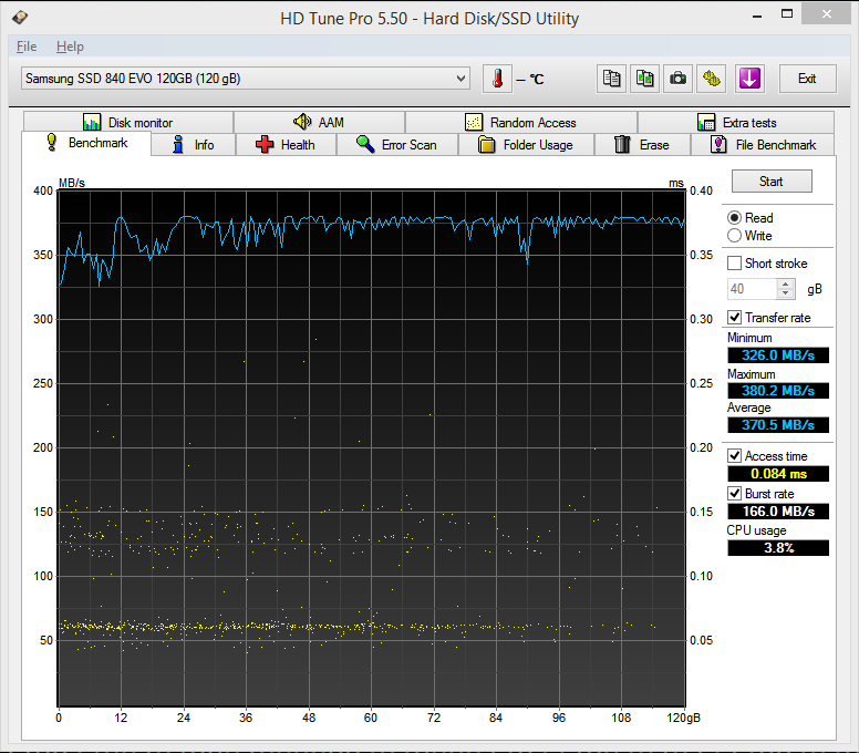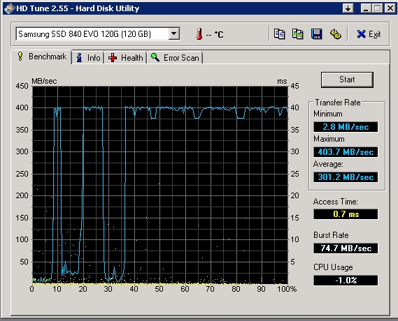 Mit HD Tach sah es bei meiner 840 EVO 500 GB vorhin auch sehr schlecht aus. Ich hatte damit im letzten Jahr meine alte WD Black 640 GB komplett ersetzt (die dient nur noch als System-Backup) und die meisten Daten auch seitdem nicht mehr angesehen. Nahezu alle beschriebenen Bereiche (180 GB belegt) lagen bei ca. 40-50 MB/s, die leeren Bereiche bei knapp 400 MB/s.