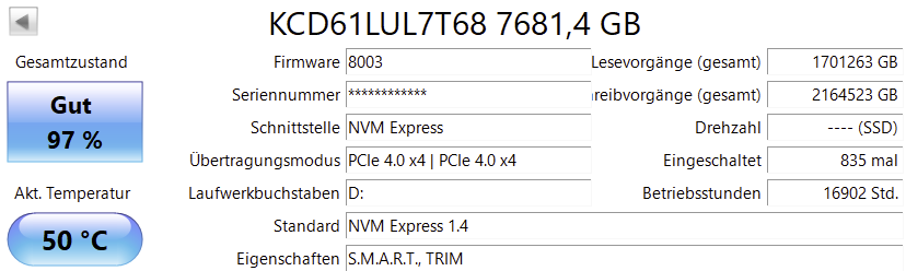 P.S. hatte noch die Samsung PM9A3 15,36 TB im Kopf, als sie letzten Sommer ~1.000,-€ gekostet hat und ich geliebäugelt hatte... Dachte naiv - naja, Preise sind rauf, kostet bestimmt locker 1.500... Sehe gerade: