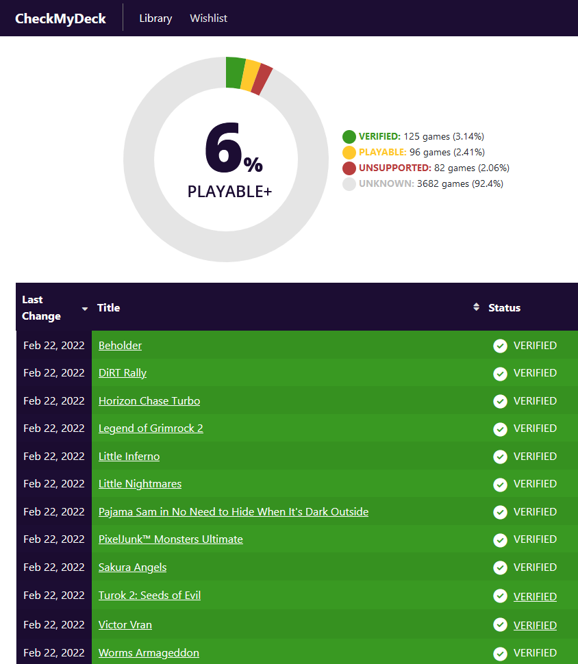 @Cohen nicht schlecht fast 4000 Spiele 😳, bei meiner kleinen Steam Sammlung habe ich bereits fast ein Fünftel verified/playable erreicht. Super finde ich das CheckMyDeck Last Changed eingebaut hat, das macht das ganze sehr übersichtlich.