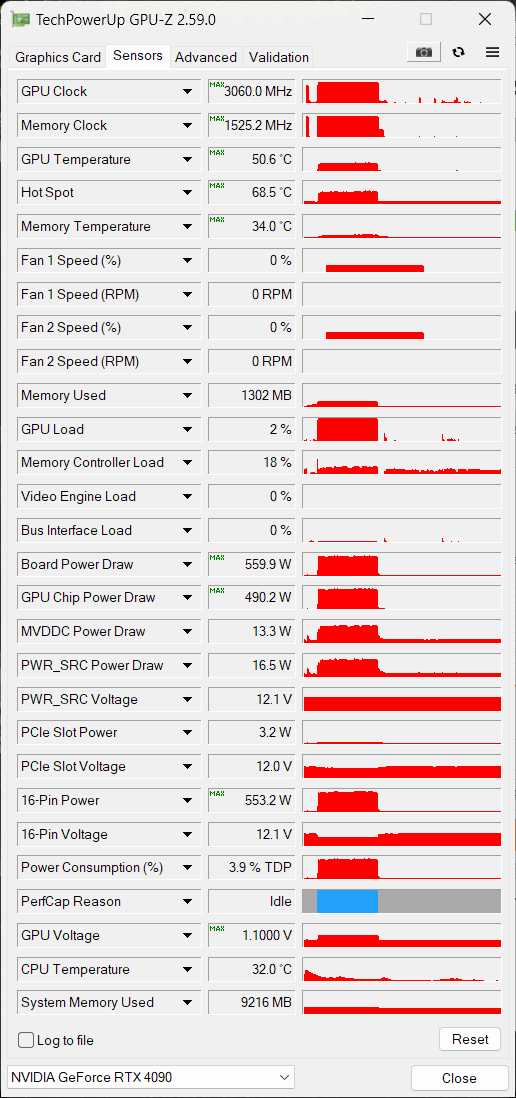 Danke, ich hab auch das Gefühl der CPU passt noch gut zur 4090. Hier ist natürlich Overclocking mit Wasserkühlung im Spiel. Damit die 3GHz auch unter Last anliegen braucht die GPU alleine dann schon 560 Watt. (Board Power Draw, mittig)