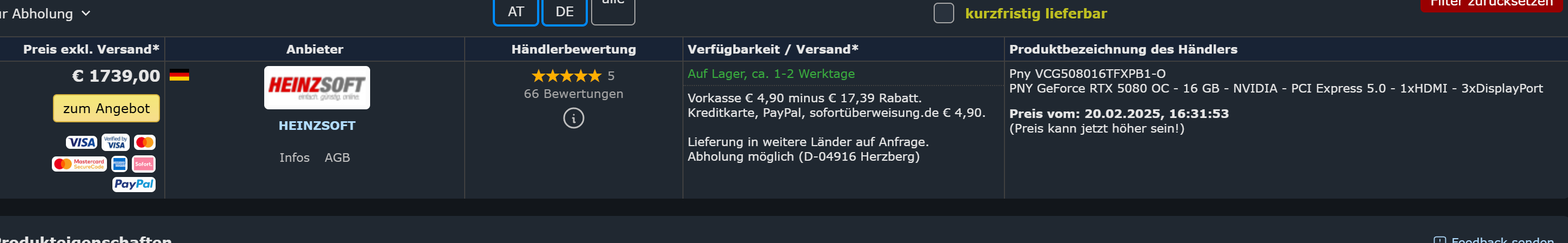 Folgt man den laut Geizhals im verfügbaren einzelnen Links, sind 2 beim Händler dann doch nicht mehr verfügbar (Link 1 für 1780€ und Link 2 für 1690€). Ein weiteres Geizhals Listing ist mittlerweile im Preis teurer, als noch bei Geizhals angegeben