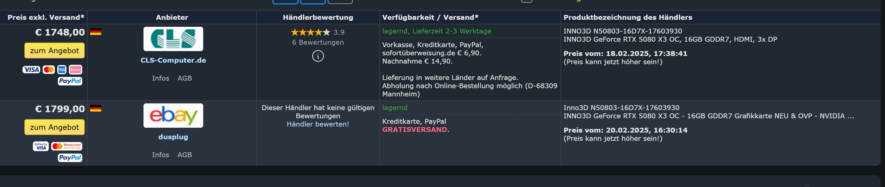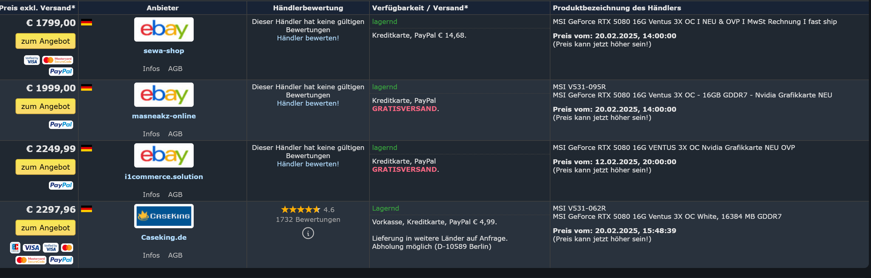 für die 5080 gibt es 69 Einträge mit Status Lieferbar von insgesamt 133 gelisteten, die günstigste über einen Ebay / Amazon Marketplace Scalper gelistete und lieferbare 5080 kostet momentan1640€.