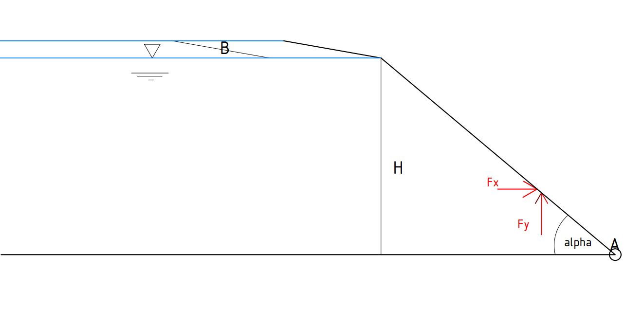Gesucht sind die Kräfte auf die um Alpha geneigte Beckenwand(Breite B) durch die Flüssigkeit (Höhe H) mit der Dichte p_H2O.