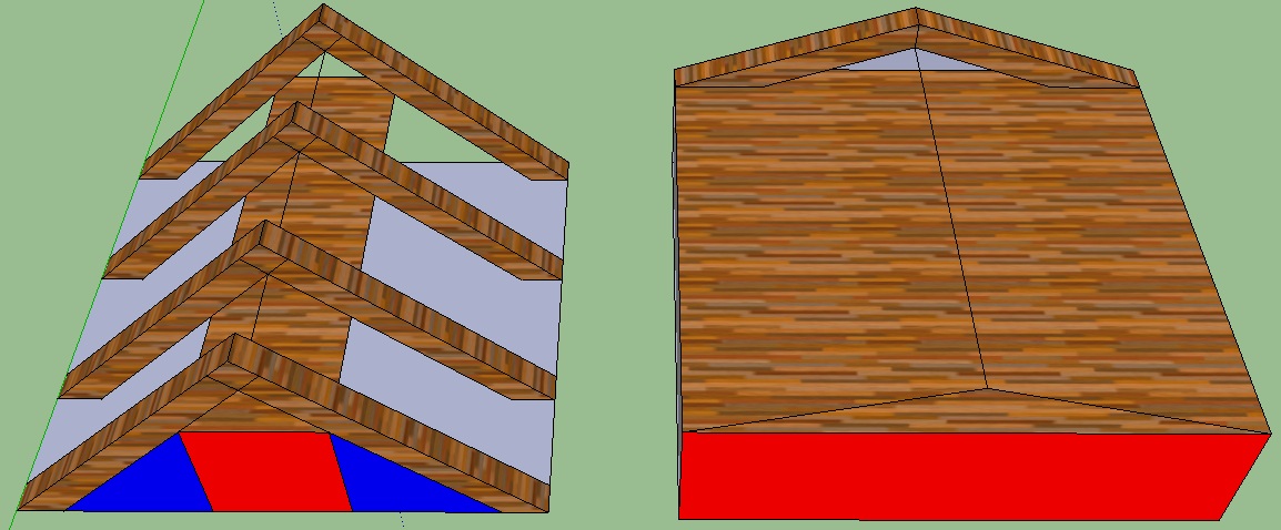 Auf der rechten Seite sieht man dann wie es sein soll. Die Blauen Flächen (die Schrägen) verschwinden indem Wände gezogen werden. Und dafür braucht man dann eine Decke. Das ist wie links die Decke, nur eben breiter. Nicht 3m sondern 8,5m.