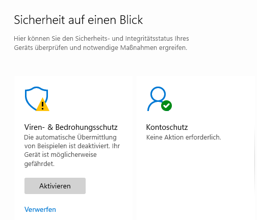 Du lässt dich von MS in die Irre führen. Dein Virenschutz ist aktiviert, nur hätte MS gerne automatisch "Beispiele" von dir zugeschickt, sprich Dateien, die der Defender verdächtig findet. Da kannst du getrost auf "Verwerfen" klicken. Das kommt bei mir auch in regelmäßigen Abständen hoch. Total nervig.