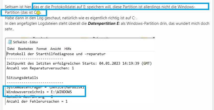 In den angefügten Logdateien steht überall die Datenpartition E: als Windows-Partition drin, das wundert mich doch sehr..
