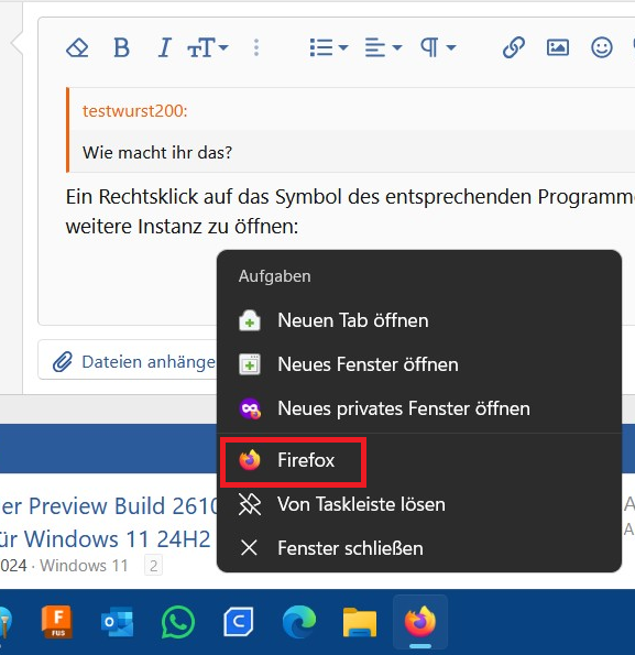 Ich hefte den Firefox an und klicke dann darauf. Nun habe ich den Browser offen und möchte jedoch ein weiteres Fenster öffnen (keinem Tab)