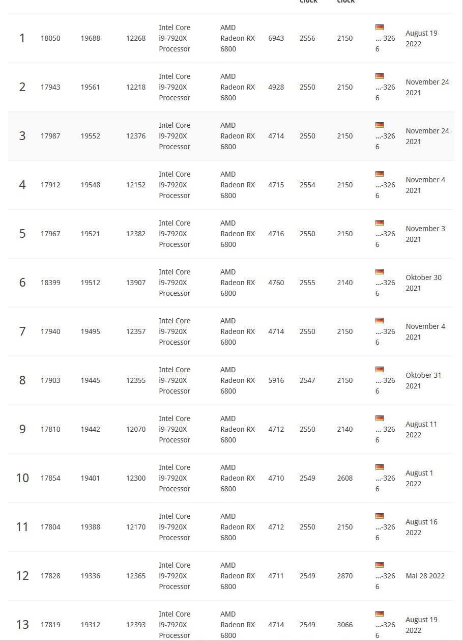 Da mir beim Ausloten der effizientesten Einstellungen schon das Potenzial aufgefallen war, konnte ich nicht umher einen Rekordversuch zu starten. Die 6600XT, 6700XT und 6900XT Toxic von mir hatten ja auch schon sehr weit vorne gelegen. Leider habe ich keinen Vergleich gefunden, aber es kann gut sein, dass das eine der schnellsten luftgekühlten Big Navi Karten der Welt ist. Einen Wasserkühler braucht die MERC jedenfalls nicht. Das Problem wird nämlich eher die Stromversorgung und Belastbarkeit der Bauteile generell. Das Problem hätte man auch mit WaKü. Ich vermute dass andere nur mit Minustemperaturen schneller sind. Die helfen nämlich beim Extrem-Übertakten den Stromverbrauch zu senken, bzw. auch dabei höhere Taktraten bei weniger Spannung zu fahren. Für diese Benchmarks habe ich ganz andere Einstellungen verwendet und bin an die Grenze dessen gegangen was ich verantworten kann. Die Karte soll schließlich nicht kaputt gehen. Ca. 2,7 GHz auf dem Kern, 2125 MHz auf dem Cache und 2,4 GHz auf dem Speicher lagen unter Last an und waren auch stabil.