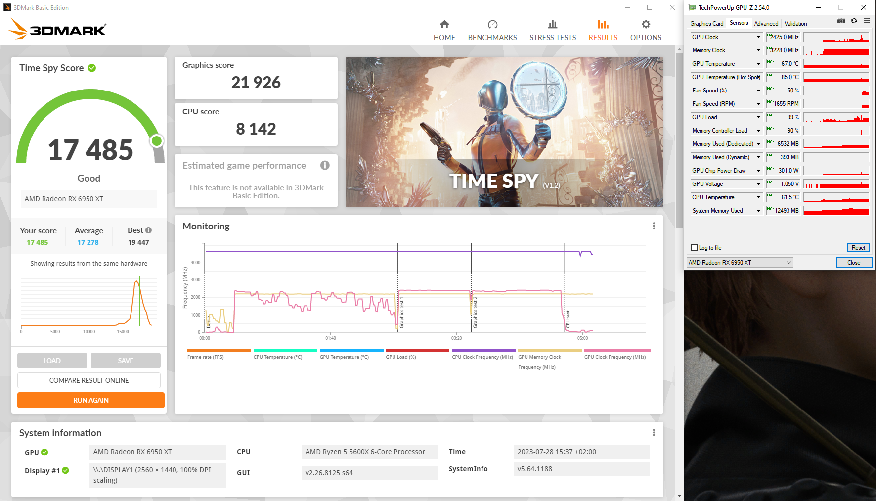 Da mir beim Ausloten der effizientesten Einstellungen schon das Potenzial aufgefallen war, konnte ich nicht umher einen Rekordversuch zu starten. Die 6600XT, 6700XT und 6900XT Toxic von mir hatten ja auch schon sehr weit vorne gelegen. Leider habe ich keinen Vergleich gefunden, aber es kann gut sein, dass das eine der schnellsten luftgekühlten Big Navi Karten der Welt ist. Einen Wasserkühler braucht die MERC jedenfalls nicht. Das Problem wird nämlich eher die Stromversorgung und Belastbarkeit der Bauteile generell. Das Problem hätte man auch mit WaKü. Ich vermute dass andere nur mit Minustemperaturen schneller sind. Die helfen nämlich beim Extrem-Übertakten den Stromverbrauch zu senken, bzw. auch dabei höhere Taktraten bei weniger Spannung zu fahren. Für diese Benchmarks habe ich ganz andere Einstellungen verwendet und bin an die Grenze dessen gegangen was ich verantworten kann. Die Karte soll schließlich nicht kaputt gehen. Ca. 2,7 GHz auf dem Kern, 2125 MHz auf dem Cache und 2,4 GHz auf dem Speicher lagen unter Last an und waren auch stabil.