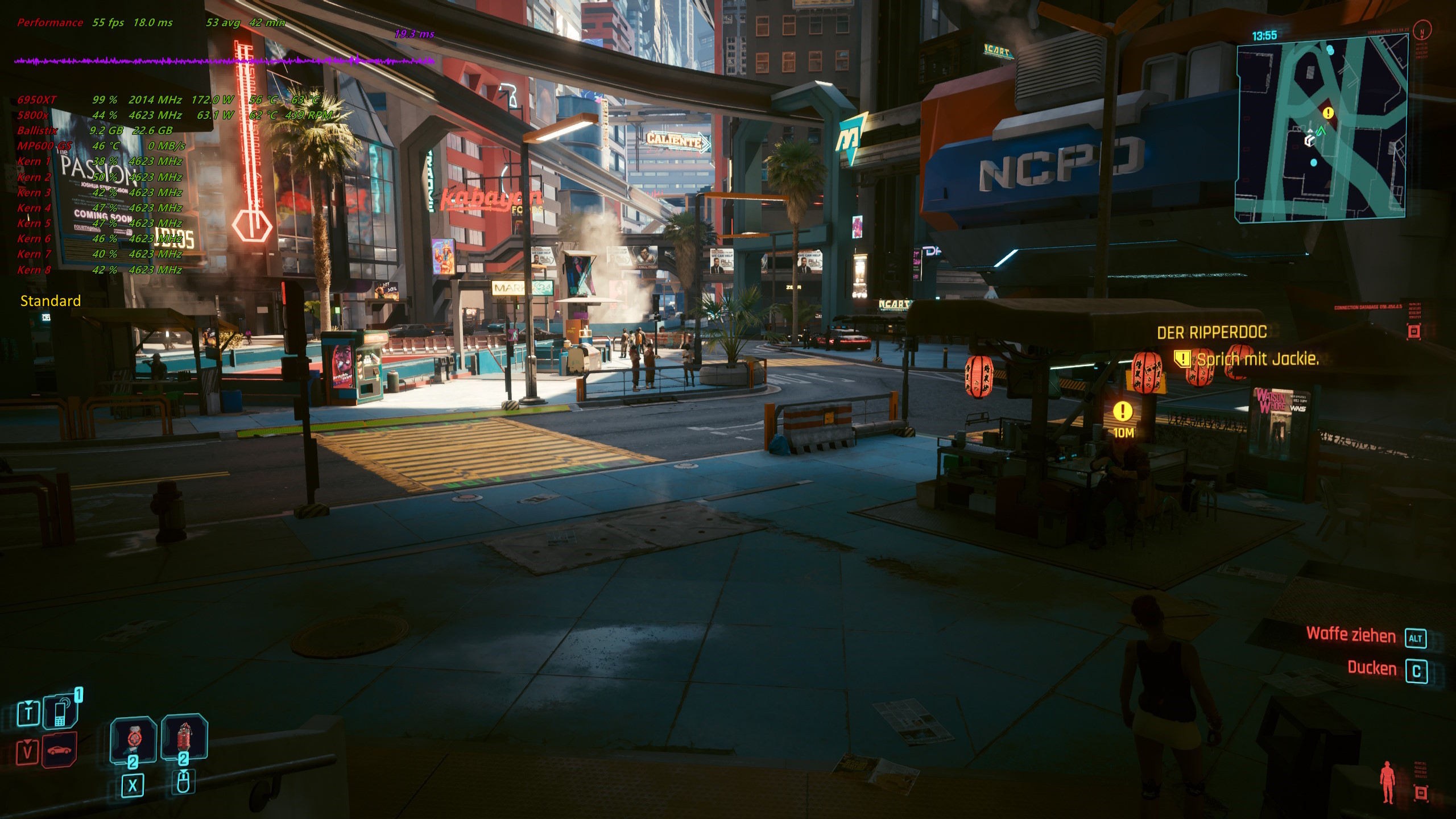Hier noch mal die selbe Szene mit identischen Einstellungen, nur dass die GPU standardmäßig läuft. Die FPS sind aufgrund des RT fast identisch zu meiner optimierten Variante. Langfristig liefert meine Einstellung aber konstanter Leistung und läuft nicht ins Powerlimit. In anderen Spielen und Benchmarks liegt die Leistung meiner Profile immer über dem Standard. Außerdem wäre der Unterschied noch größer, wenn man mein Profil nicht mit einer 50er Karte vergleichen würde, sondern mit einer non-50er.